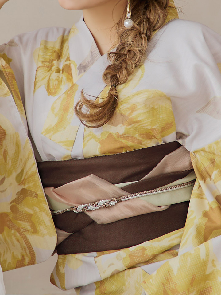 グレージュ地にイエローのラナンキュラスが可愛い大人浴衣。