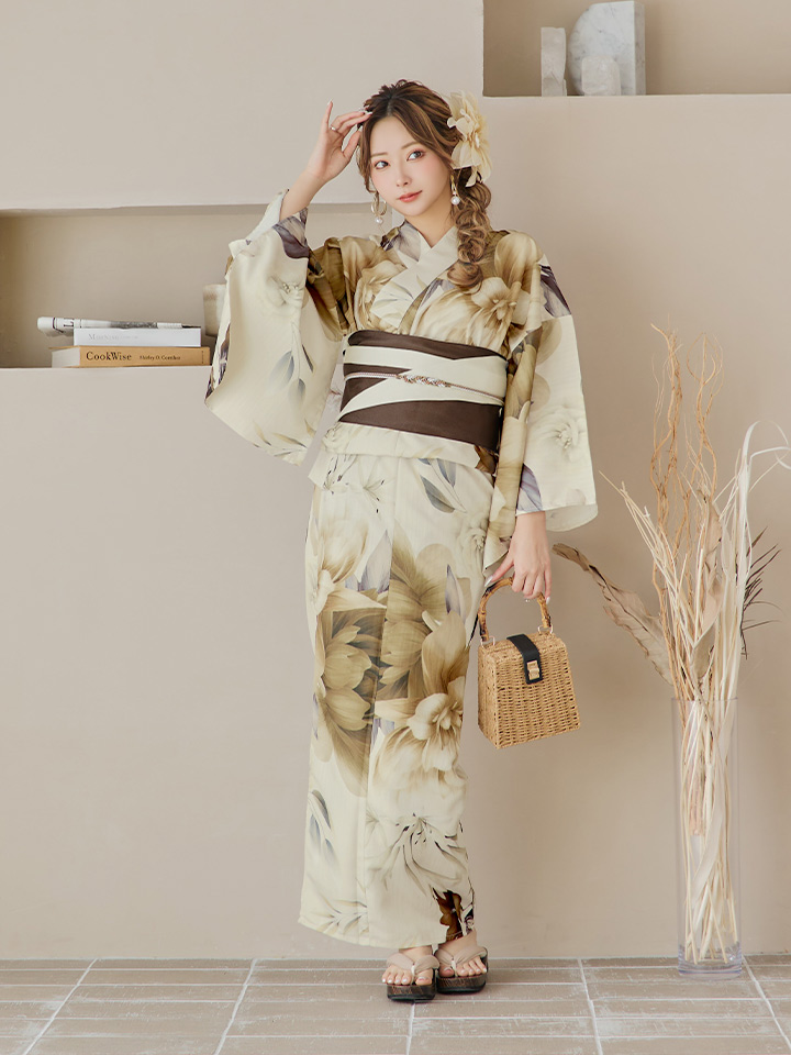 【即日発送】ブラウンベージュクラシックフラワー浴衣【浴衣3点セット 浴衣/帯/下駄】[YMT] [Y-8052-nz-dzh-BE-F-24PY]