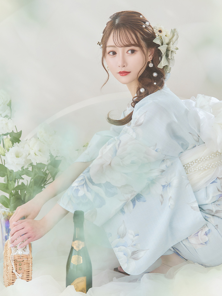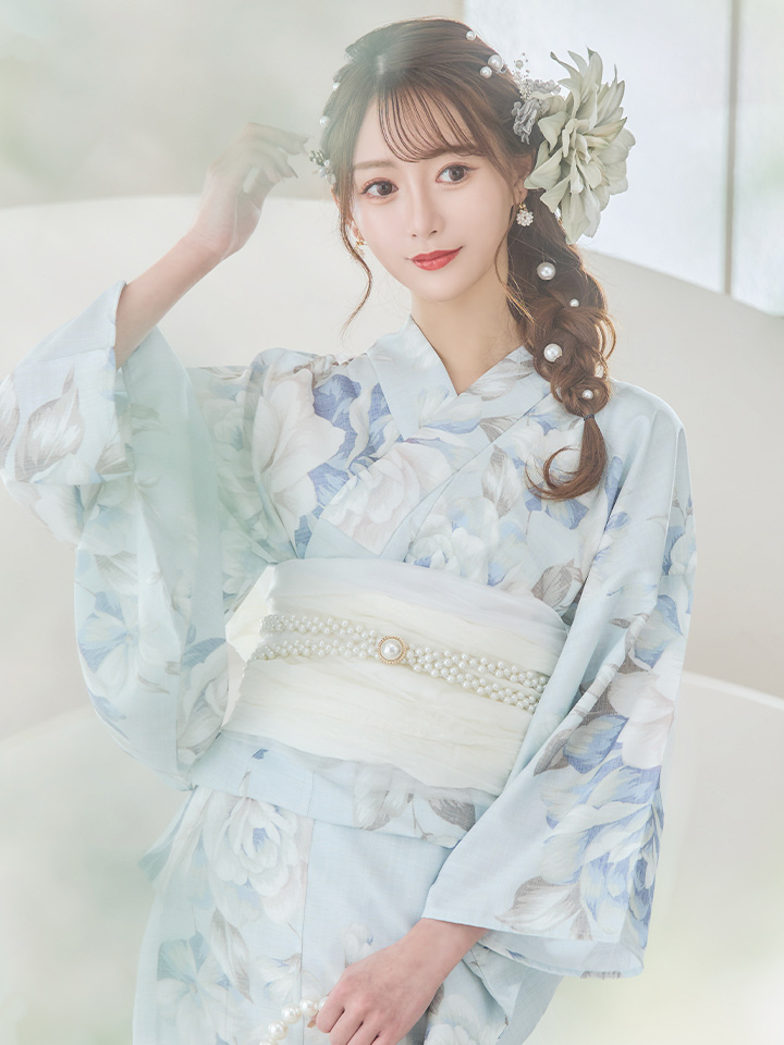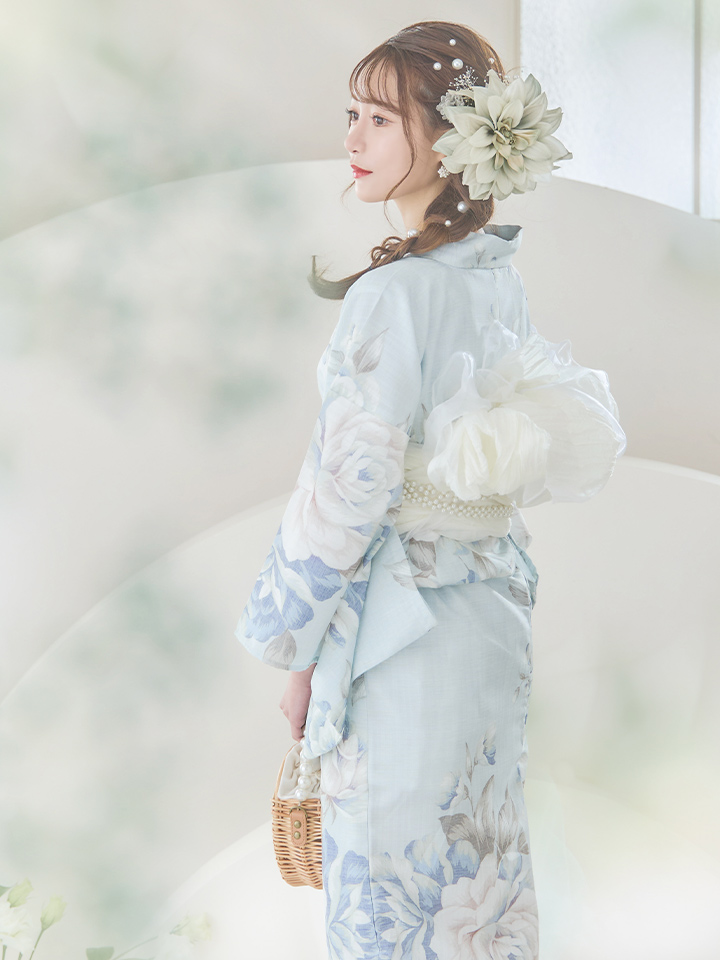 クラシカルなブルーの薔薇が咲く涼しげな浴衣。