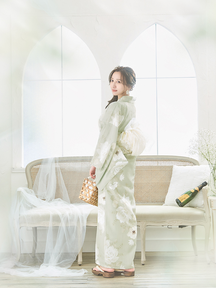 【即日発送】くすみグリーン×ホワイトフラワー浴衣 【浴衣3点セット 浴衣/帯/下駄】[YMT] [Y-9013-ok-BL-F-24sou]