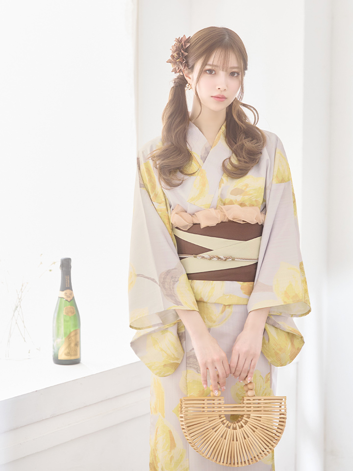 グレージュ地にイエローのラナンキュラスが可愛い大人浴衣。