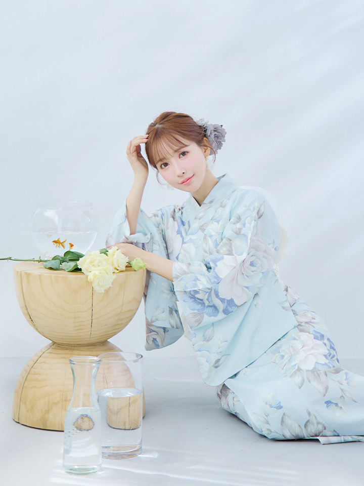 クラシカルなブルーの薔薇が咲く涼しげな浴衣。