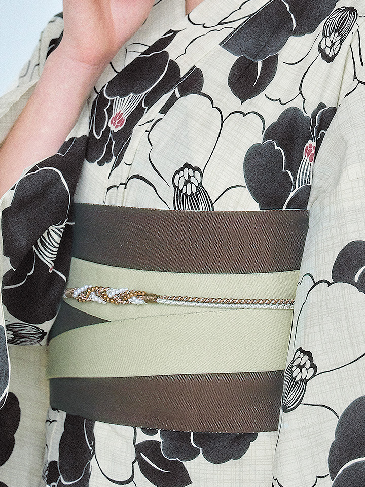 ホワイトグレーの小柄チェック地にモノトーンツバキを乗せた大正モダン夏浴衣♥