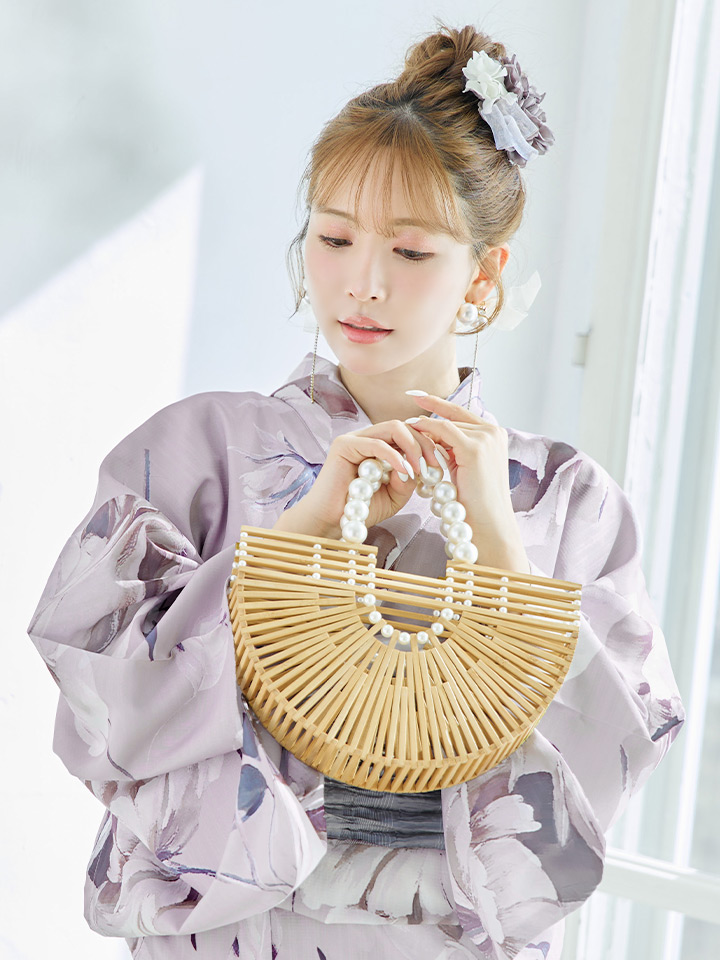 くすんだピンクベージュ地に咲くロマンティックな牡丹が可愛い大人浴衣。