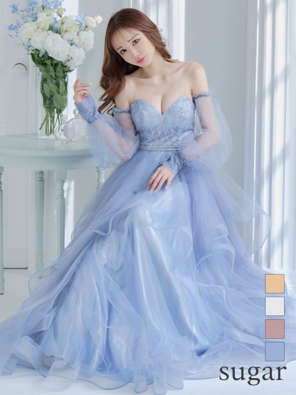 Lサイズあり【JEAN MACLEAN/ジャンマクレーン】 オフショル/ 2way/ ロングスリーブ/ レース/ 刺繍/ リボン/ プリンセス/ ロングドレス/ キャバドレス long【OF02】 [41555-JM-BL-S2405]