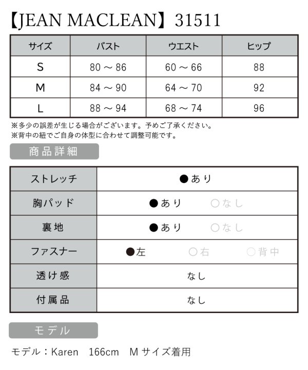 ※商品によって、ホック部分が金具に引っかけるタイプとドレス本体に引っかけるタイプがございます。【JEAN MACLEAN/ジャンマクレーン】