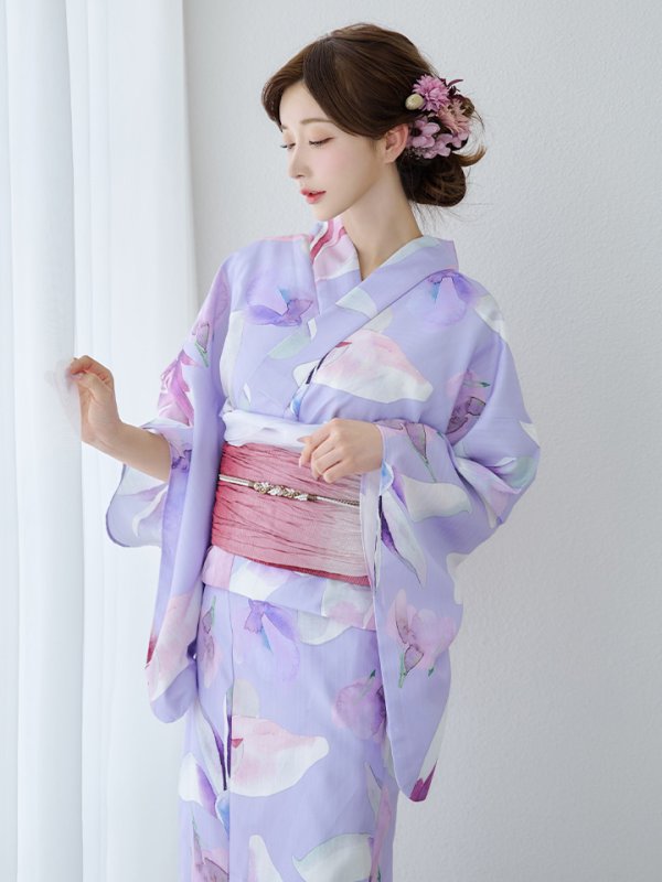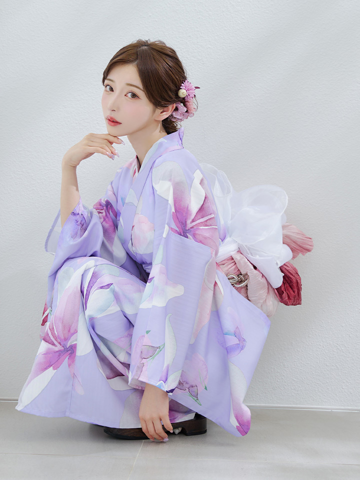 パープル地に咲く百合の花びらが上品で大人な清涼感のある浴衣