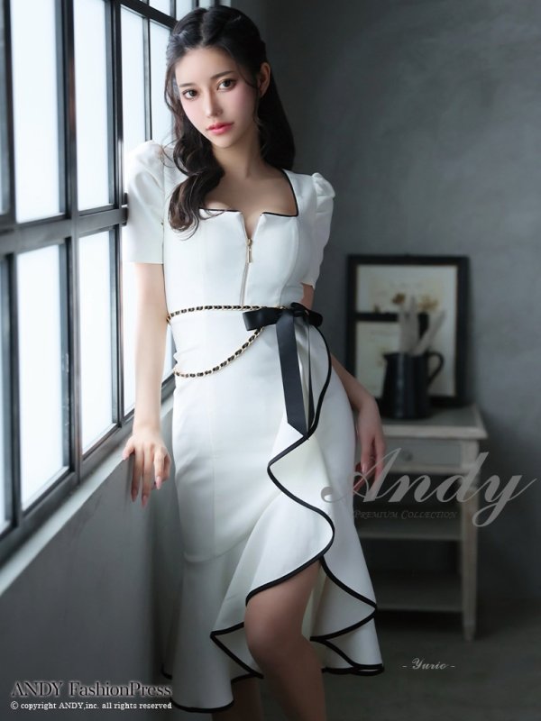 【ANDY/アンディ】 チェーン付き/ ストレッチ/ バイカラー/ パイピング/ 袖あり/ 半袖/ フリル/ 膝丈/ ミディアムドレス/ キャバドレス[OF05] [ON2842-WB-2406]