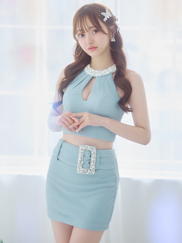 XSサイズあり【PURESS/ピュアレス】デコルテビジュー/ ビックパール/ ビジューバックル/ セパレート/ タイト/ マイクロミニ/ ミニドレス/ キャバドレス[OF5] [PS802412-SAX-S240624]