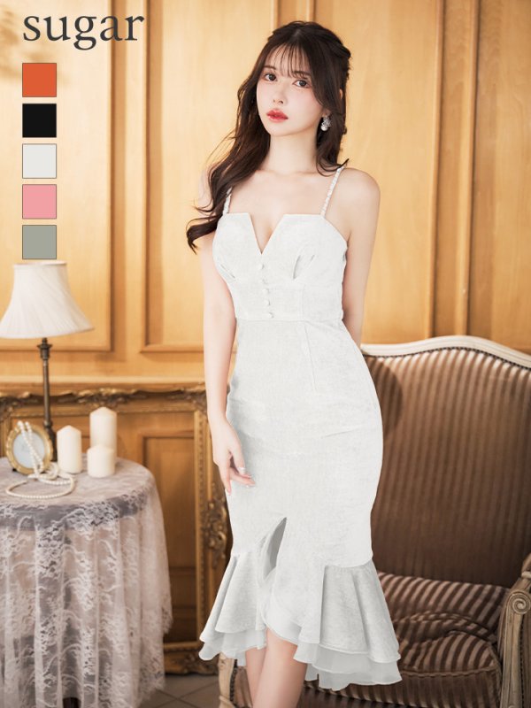Lサイズあり【DEA./ディア】マーメイド/ スエード/ フロントボタン/ キャミソール/ ワンカラー/ フリルテール/ ミディアムドレス/ キャバドレス【OF08】 [DE2884-IV-S240802]