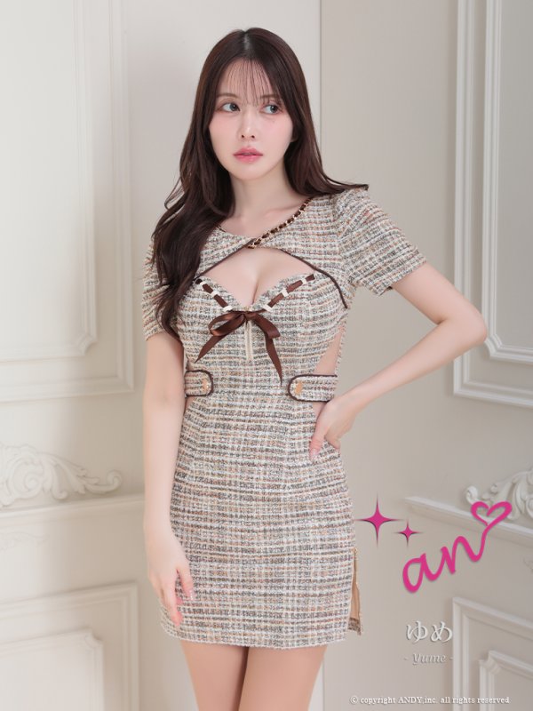 XSサイズあり【an /アン】 フロントジップ/ チェック/ ツイード/ リボン/ 袖あり/ 半袖/タイト/ ミニドレス/ キャバドレス[OF05] [AOC3715-BEBR-2408]
