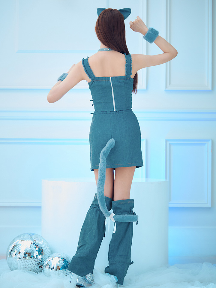 ねこ キャット 猫 リボン デニム Y2K ワンピース セクシー コスプレ 青 ブルー