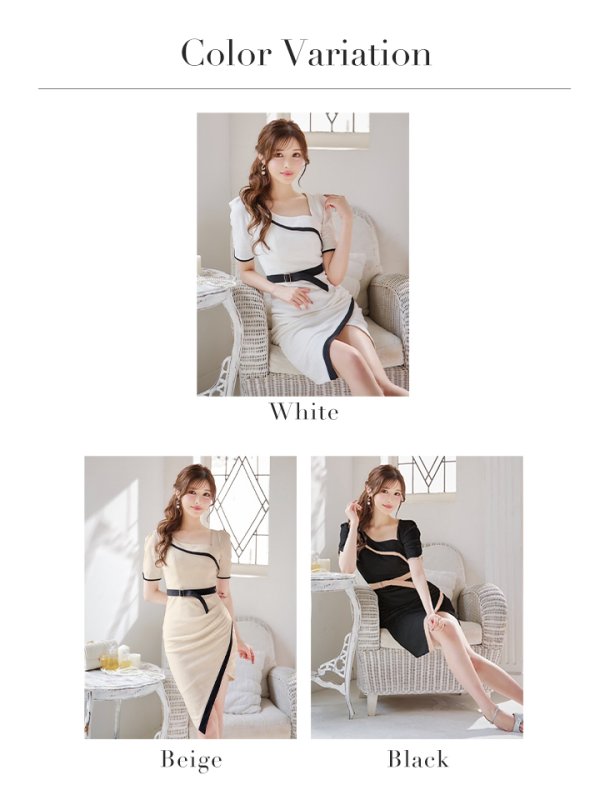 Lサイズあり【JEAN MACLEAN/ジャンマクレーン】バイカラー/ ベルト/ 半袖/ 袖あり/ アシンメトリー/ タイト/ ひざ丈/ ミディアムドレス/ キャバドレス[OF2A] [45982-JM-W-S240819]