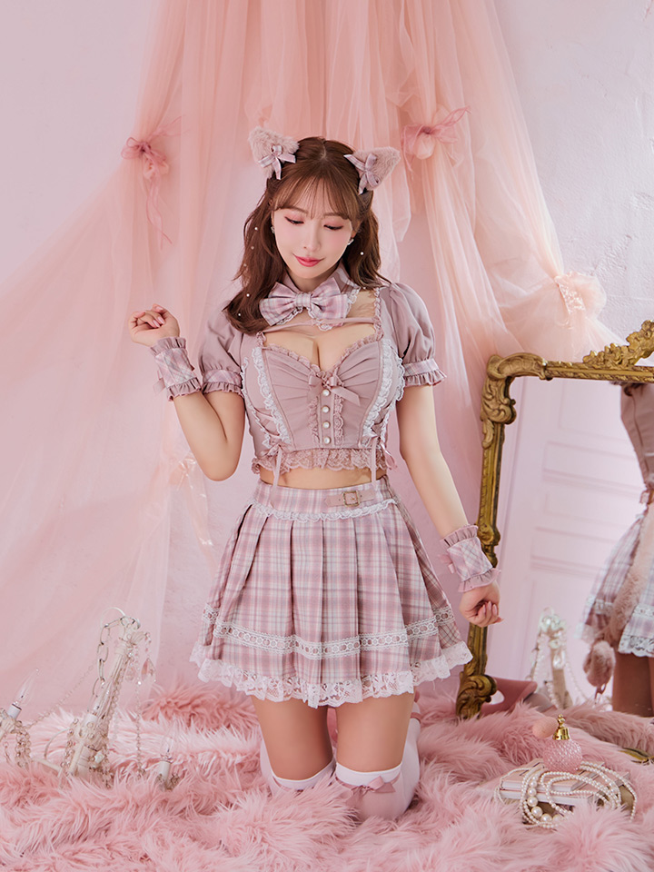 猫 アイドル チェック 制服風 リボン 甘い あざと コンカフェ スイート あまい フレア ミニ セットアップ セクシー コスプレ