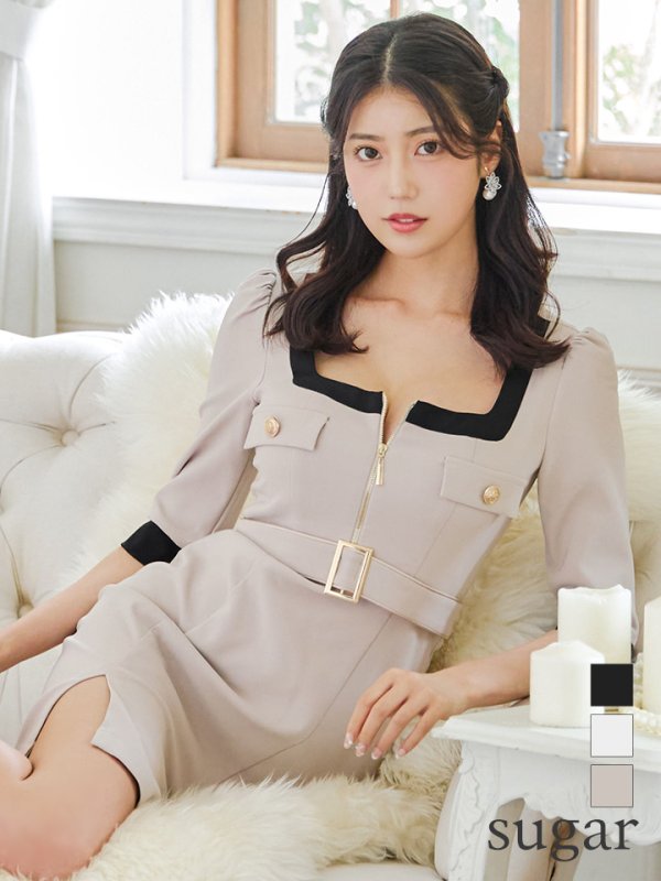 XSサイズあり【ANDY/アンディ】バイカラー/ フロントジップ/ ベルト/ 袖あり/ 七分袖/ ゴールドボタン/ タイト/ ミニドレス/ キャバドレス[OF05] [ON2892-BExB-S240928]