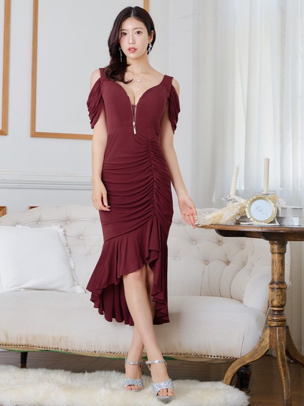 Lサイズあり【JEAN MACLEAN/ジャンマクレーン】マーメイド/ ワンカラー/ ニット/ フリルテール/ フロントジップ/ ストレッチ/ ひざ丈/ ミディアムドレス/ キャバドレス[OF2A] [45991-JM-Wine-S241018]