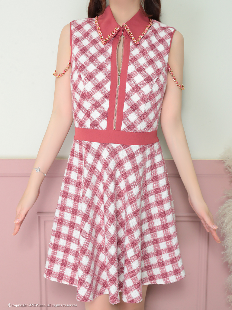 XSサイズあり【an /アン】 ノースリーブ/ 襟あり/ ツイードチェック/ チェーン/ フロントジップ/ Aライン/フレア/ ミニドレス/ キャバドレス[OF05] [AOC3735-NVCK-2410]