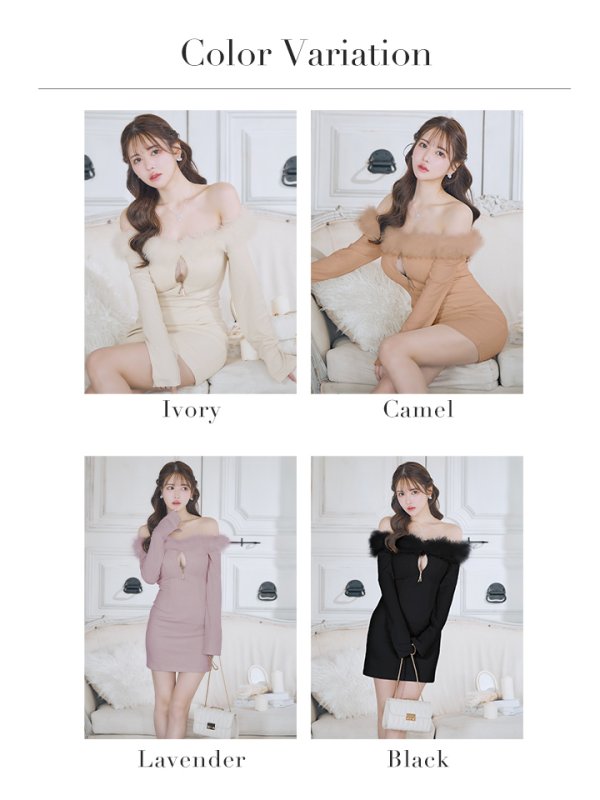 XSサイズあり【Glossy/グロッシー】2way/ オフショル/ ファー/ バストジップ/ リブニット/ タイト/ ミニドレス/ キャバドレス[OF08] [GL3612-CAMEL-S241029]