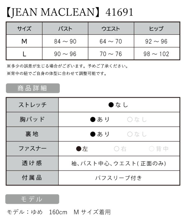 ※商品によって、ホック部分が金具に引っかけるタイプとドレス本体に引っかけるタイプがございます。【JEAN MACLEAN/ジャンマクレーン】