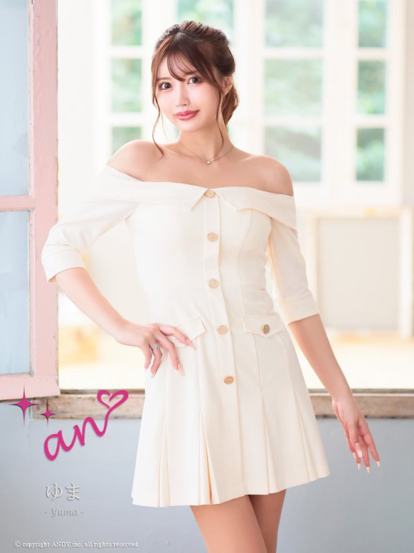 XSサイズあり【an /アン】オフショルダー/ 袖あり/ ハーフスリーブ/ ボタン/ プリーツ/ Aライン/ ミニドレス/ キャバドレス[OF05] [AOC3790-W-2411]