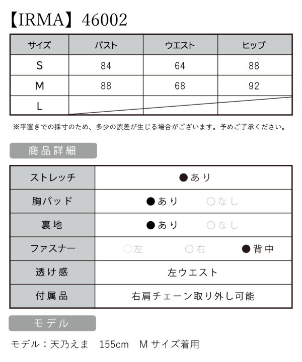 B:80-86 / W:60-66 / H:88-92 [着丈](脇下)約134cm |