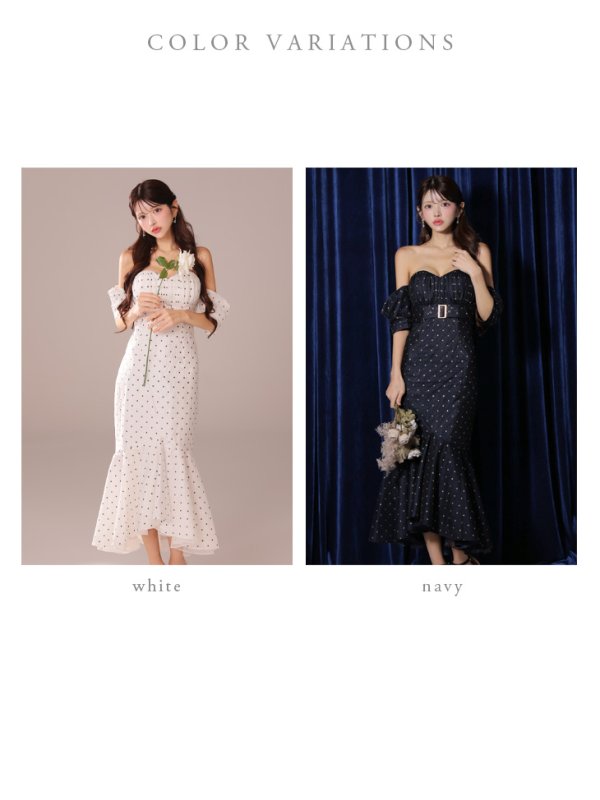 XS-Lサイズあり【DEA./ディア】ドット/ オフショル/ マーメイド/ ミモレ丈/ ミディアムドレス/ キャバドレス [OF08]long [DE3369-W-2411]
