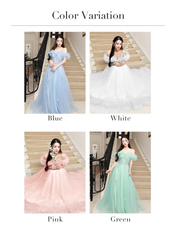 ボリューム感たっぷりのチュールフリルオフショルが華やかなプリンセスロングドレス♡