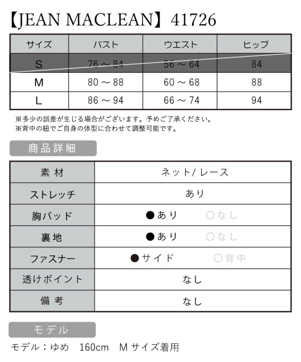 B:90-96 / W:70-76 / H:98-102 [着丈](脇下)約134cm |