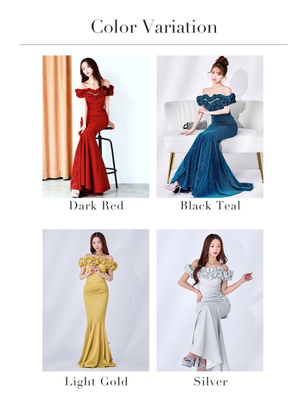 Lサイズあり【UNA VALERIE / ウナヴァレリェ】フリル/ オフショル/ バックスピンドル/ ラメニット/ マーメイド/ ロングドレス/ キャバドレス long[OF05] [V60175L-CHP-S2501]