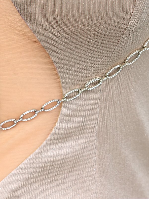 高級感のあるラメ生地にワンポイントのチェーンがスタイリッシュな印象のタイトドレス。