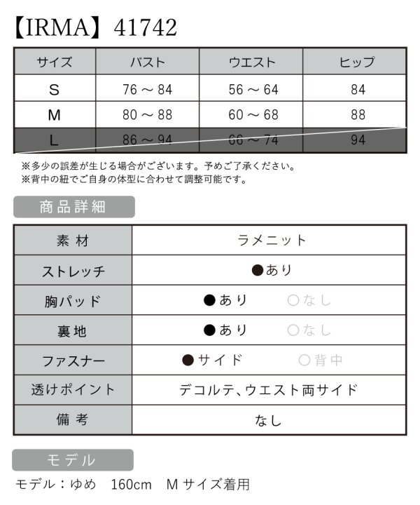 B:76-84 / W:56-64 / H:84 [着丈](脇下)約135cm |