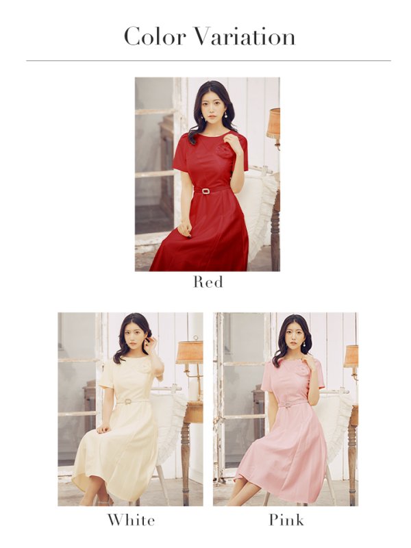 XS-Lサイズあり 【GINZA COUTURE/銀座クチュール】シンプル/ ワンカラー/ コサージュ/ ベルト/ 半袖/ 袖あり/ Aライン/ フレア/ ミディアムドレス/ キャバドレス[OF2] [LKC2741-R-S2501]