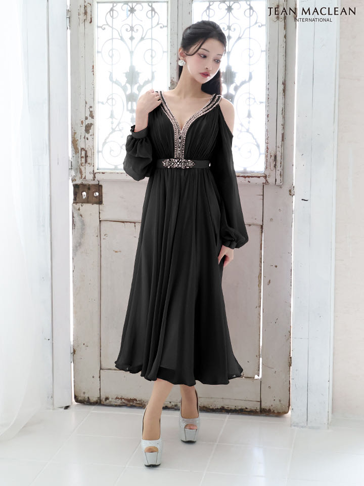 Lサイズあり【JEAN MACLEAN/ジャンマクレーン】シフォン/ オフショル/ 長袖/ 袖あり/ ビジュー/ ミモレ丈/ フレア/ ミディアムドレス/ キャバドレス[OF2A] [51757-JM-B-2501]