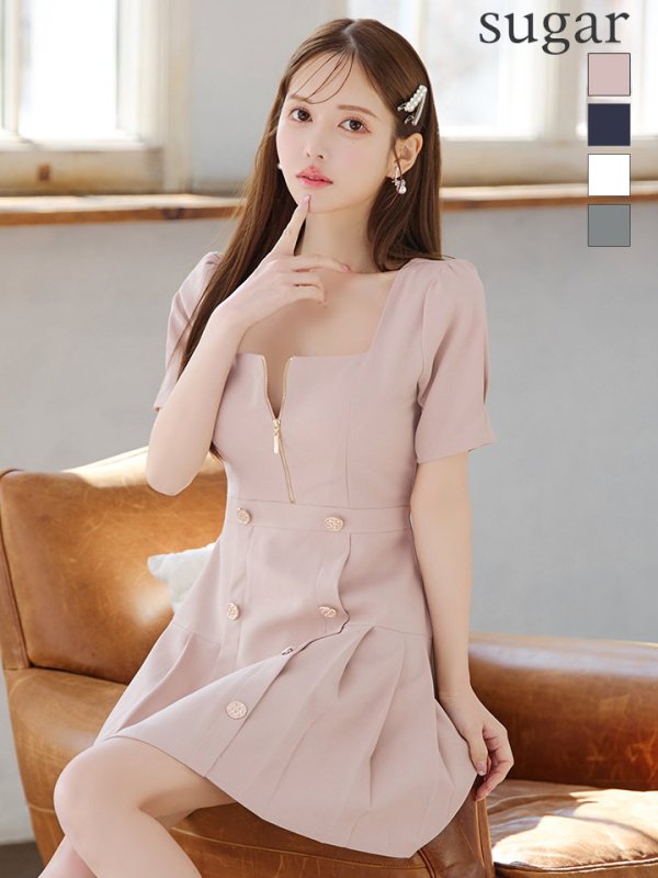 XSサイズあり【an/アン】スクエアネック/ 半袖/ 袖あり/ ボタン/ プリーツ/ フレア/ ワンピース/ ミニドレス/ キャバドレス[OF05] [AOC3809-BE-S250208]
