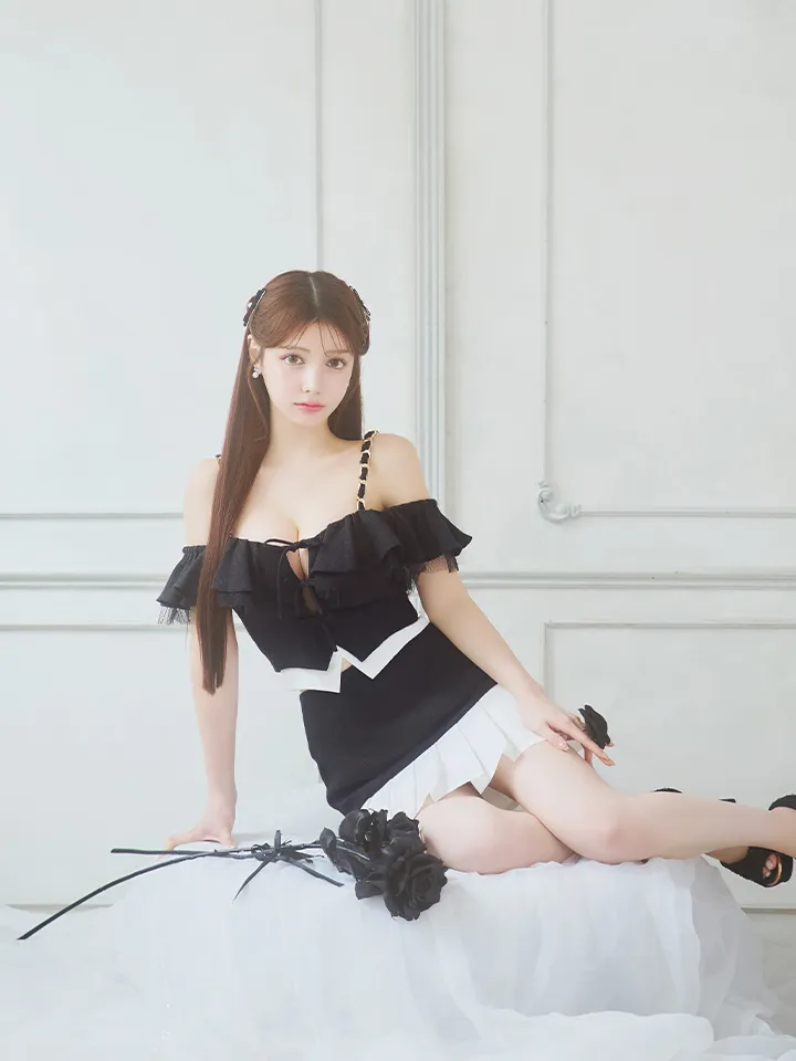 XSサイズあり【an /アン】バイカラー/ フリルオフショル/ チュール/ リボン/ ショルダーチェーン/ プリーツ/ セットアップ/ ミニドレス/ キャバドレス[OF05] [AOC3824-BxW-S250213]
