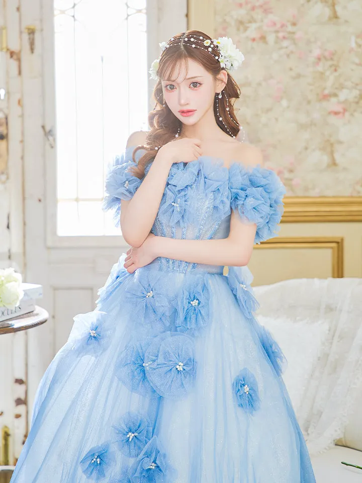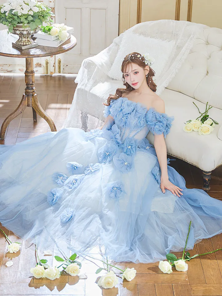 【couture an/クチュールアン】オフショルダー/ 立体フラワー/ ビジュー/ パール/ フレア/ Aライン/ プリンセス/ ロングドレス/ キャバドレス long[OF05] [AOC-WD-028-BL-S250215]