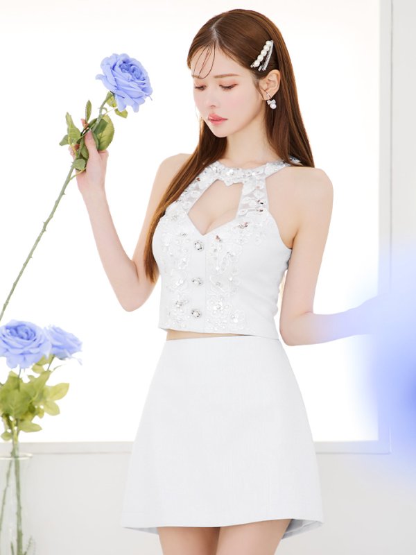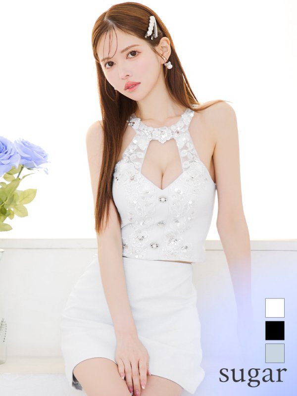 XSサイズあり【ANGEL R/エンジェルアール】ホルターネック/ ボタン/ フラワーレース/ ビジュー/ セパレート/ マイクロミニドレス/ キャバドレス[OF2] [AR25306-W-S250217]