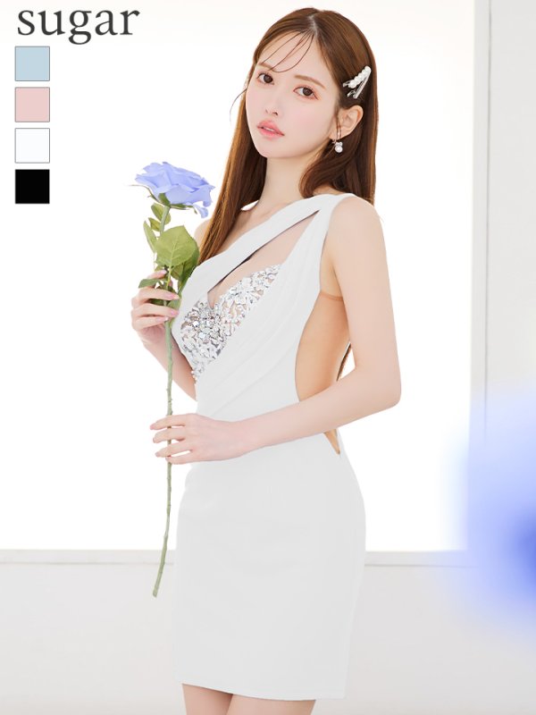大胆バストカットからレイヤード風に刺繍を覗かせたタイトミニドレス。