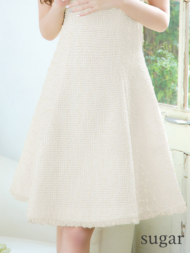 XS-Lサイズあり 【GINZA COUTURE/銀座クチュール】ツイード/ フリンジ/ ノースリーブ/ Aライン/ フレア/ ミディアム丈/ ワンピース/ ミディアムドレス/ キャバドレス[OF2] [LKC23118-W-S2502]