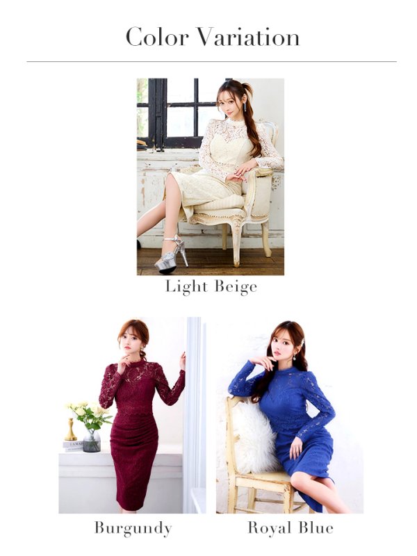 Lサイズあり【VANESSA HEART / ヴァネッサハート】【OF05】 総レース/ タック/ ハイネック/ 袖あり/ 長袖/ タイトスリーブ/ 膝丈/ ミディアムドレス/ キャバドレス [H60192H-BGD-S2502]