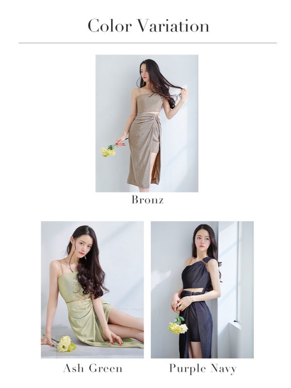 煌めくラメニットにショルダーチェーンが高級感をプラスし、ウエストからちらりと覗く素肌でセクシーさも◎