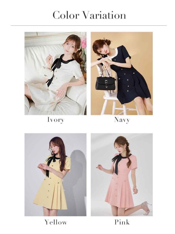 XS-Lサイズあり 【GINZA COUTURE/銀座クチュール】バイカラー/ リボン/ 半袖/ 袖あり/ プリーツ/ フレア/ Aライン/ ワンピース/ ミニドレス/ キャバドレス[OF2] [LKC24182-IV-S250228]