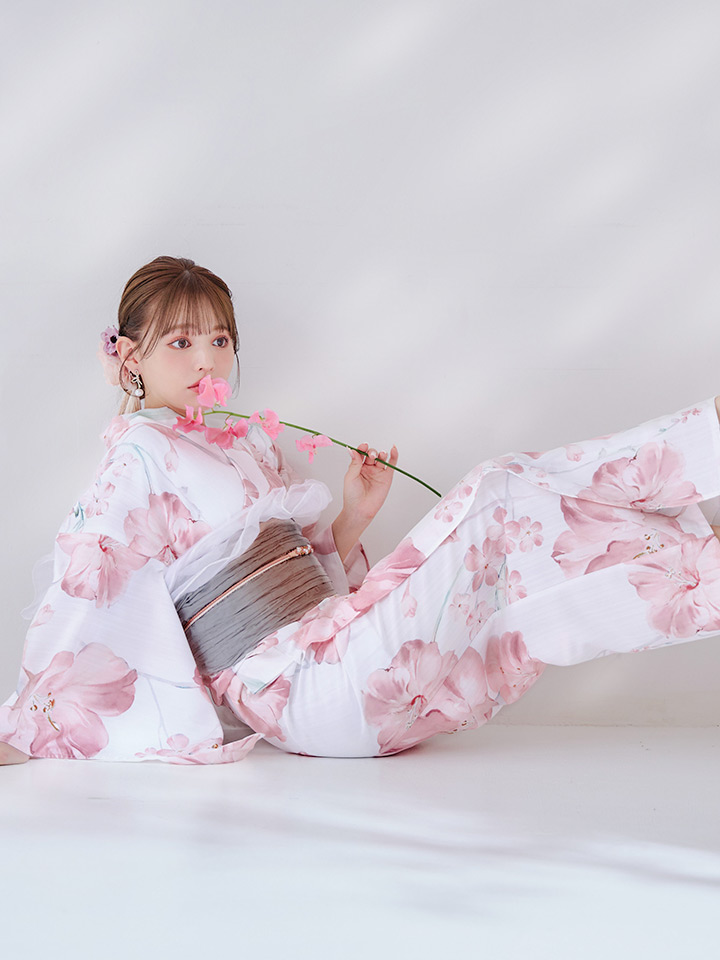 サーモンピンクのオシャレカラーが目を引くレトロモダン浴衣。