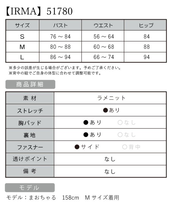 B:76-84 / W:56-64 / H:84 [着丈](脇下)約130cm |