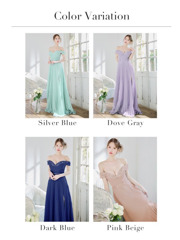 大胆なオフショルデザインとロングスリットから覗く素肌が大人の色気醸し出し、 贅沢に施されたビジューが華やかに演出◎