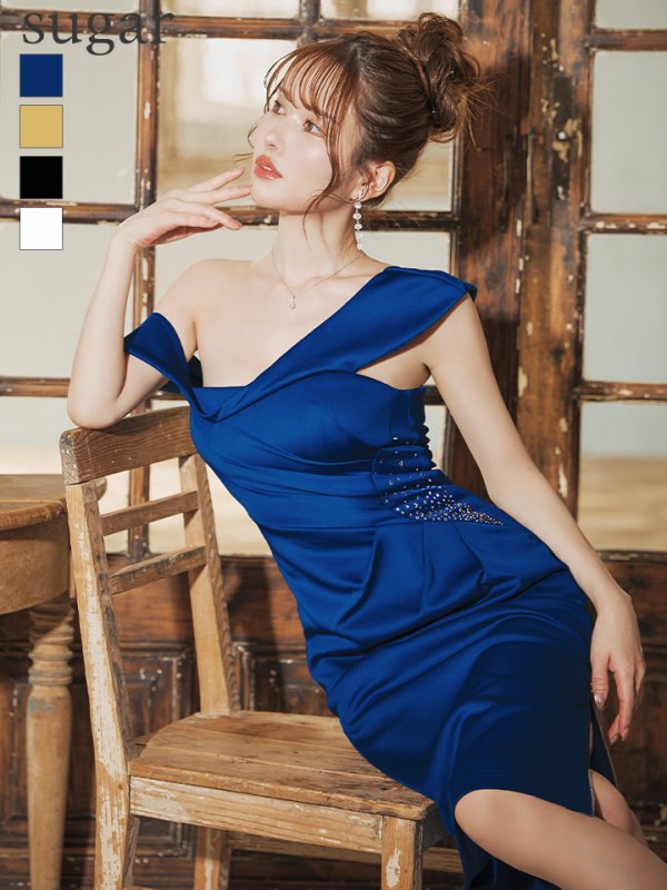 XSサイズあり【Veautt/ヴュート】【OF05】ワンショルダー/ タック/ ビジュー/ ファスナー/ ミディアムドレス/ キャバドレス [VT082505-RBL-S250307]