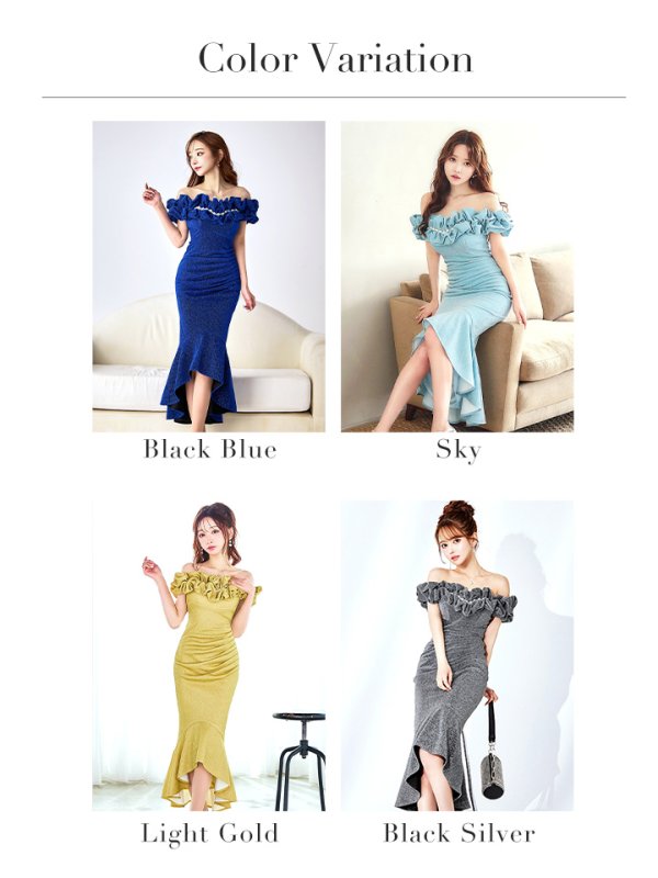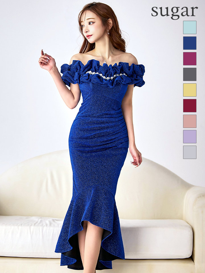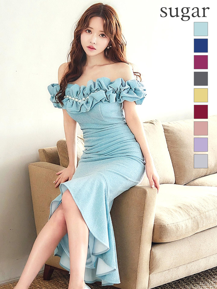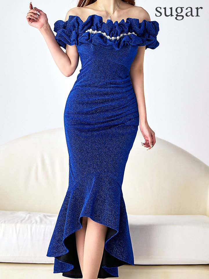 【ISA FERRIS/ イサフェリス】【OF05】フリルオフショルダー/ パール/ ラメニット/ ストレッチ/ サイドタック/ ひざ丈/ マーメイド/ ミディアムドレス/ キャバドレス [F60193H-BBGD-S2503]