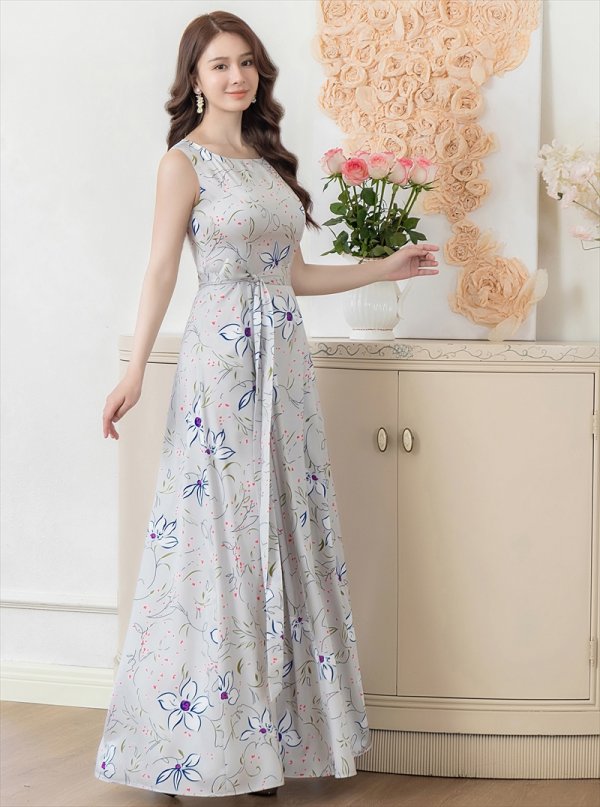 XS-Lサイズあり 【GINZA COUTURE/銀座クチュール】フラワープリント/ ノースリーブ/ ウエストリボン/ フレア/ Aライン/ ロングドレス/ キャバドレスlong[OF2] [LKC24018-GY-2503]