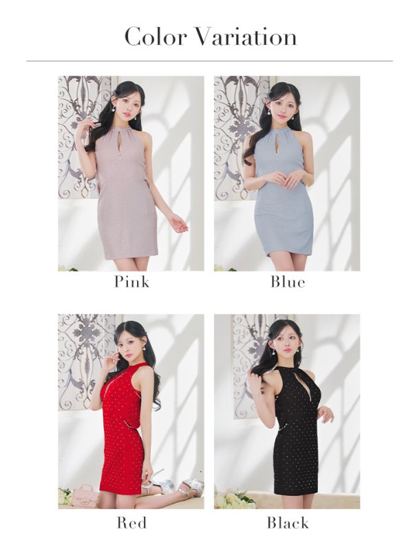 【an /アン】ラインストーン/ ラメニット/ ハイネック/ フロントジップ/ ストレッチ/ タイト/ ミニドレス/ キャバドレス[OF05] [AOC3849-BL-S250315]