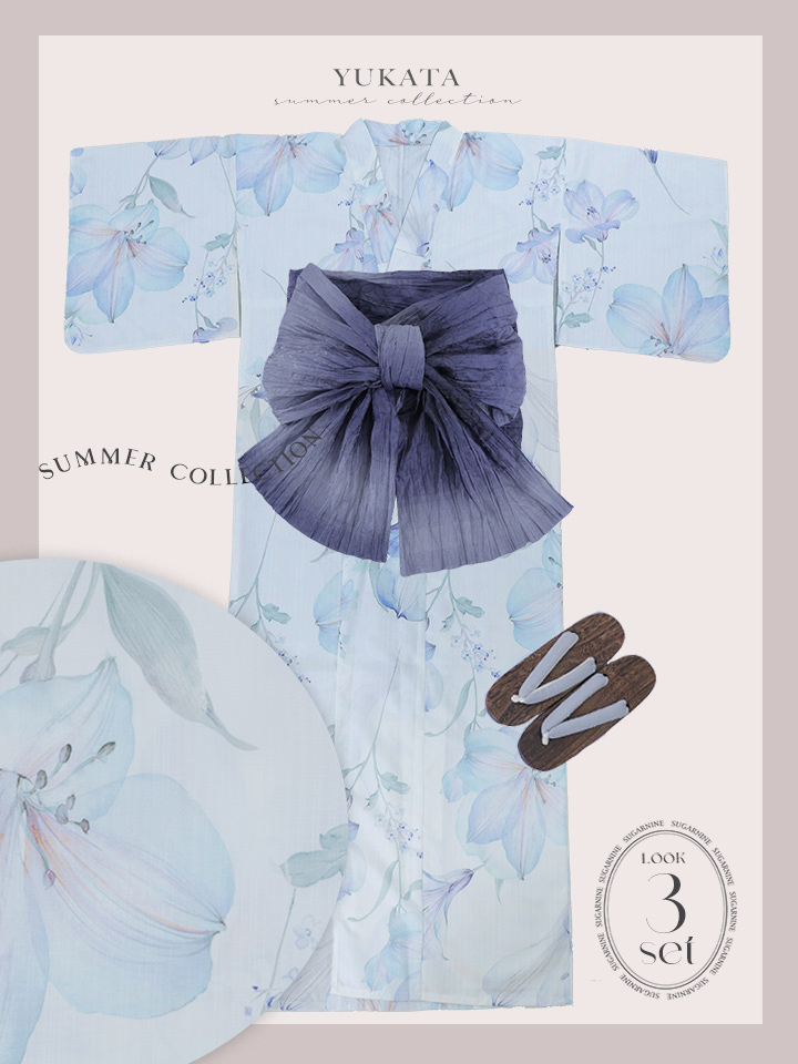 【即日発送】【浴衣セール!】水彩百合ナチュラルブルー浴衣【浴衣3点セット 浴衣/帯/下駄】[YMT] [Y-9132-nz-dzc-BL-F-25AS]